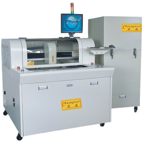 四,銑刀式郵票孔pcb分板機,全自動郵票孔pcb分板機,CW-F01(全自動郵票孔pcb分板機,CW-F01是一臺利用銑刀高速運轉將多連片方式的PCB板按預先編輯好的路徑分割的程式分板機設備。取代了人工折斷、C-CUT或PUSH的切割瑕疵,提高產品質量,減少報廢率,本程式分板機采用人機界面WindowsXP作業系統,簡明而人性化的界面設計,自動切割路徑校正系統,高像素CCD程序制作及區塊程序和單步程序編輯及修改,兩平臺交互工作的PCB的上下料裝置,能有效地降低機器等待時間,從而達到理想的生產效率。此機型分板應力在四種郵票孔pcb分板機中是最小的,通過兩個工作平臺輪流作業,可進行全自動的分板作業流程。)